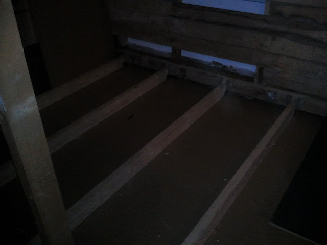 Huomenna tosiaan varmaan sitten jatkan tuon lattian levytyksen loppuun ja sitten levyjä seinille. Laskeskelin, että levyjä pitäisi jäädä vielä jokunen ylikin. Jos jää, niin laitan yläpohjaan muutaman poikittaispuun ja nostan levyt sinne. Ehkä sitten mehupullokaan ei jäätyisi umpijäähän, kuten tähän asti.